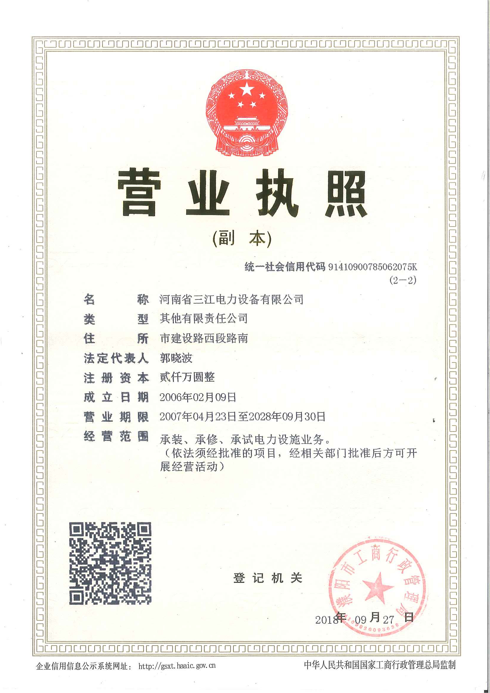 河南省三江电力设备有限公司成立于2005年10月,注册资金2000万元人民币,法人代表郭晓波。该公司是由国家能源局以及河南省建设厅批准成立的,集电力设施业务承装、承修、承试、采购、安装于一体的股份制企业,具有送变电专业承包和电力承装修叁级资质,主要承担110KV及以下的高压输电线路、电厂、工厂、小区、市政等各类变配电工程;于2009年加入河南省电力承装修试企业协会,并成为第一届常务理事成员单位;于2012年5月通过ISO9001质量管理体系认证、ISO14001环境管理体系认证、职业健康安全管理体系认证。